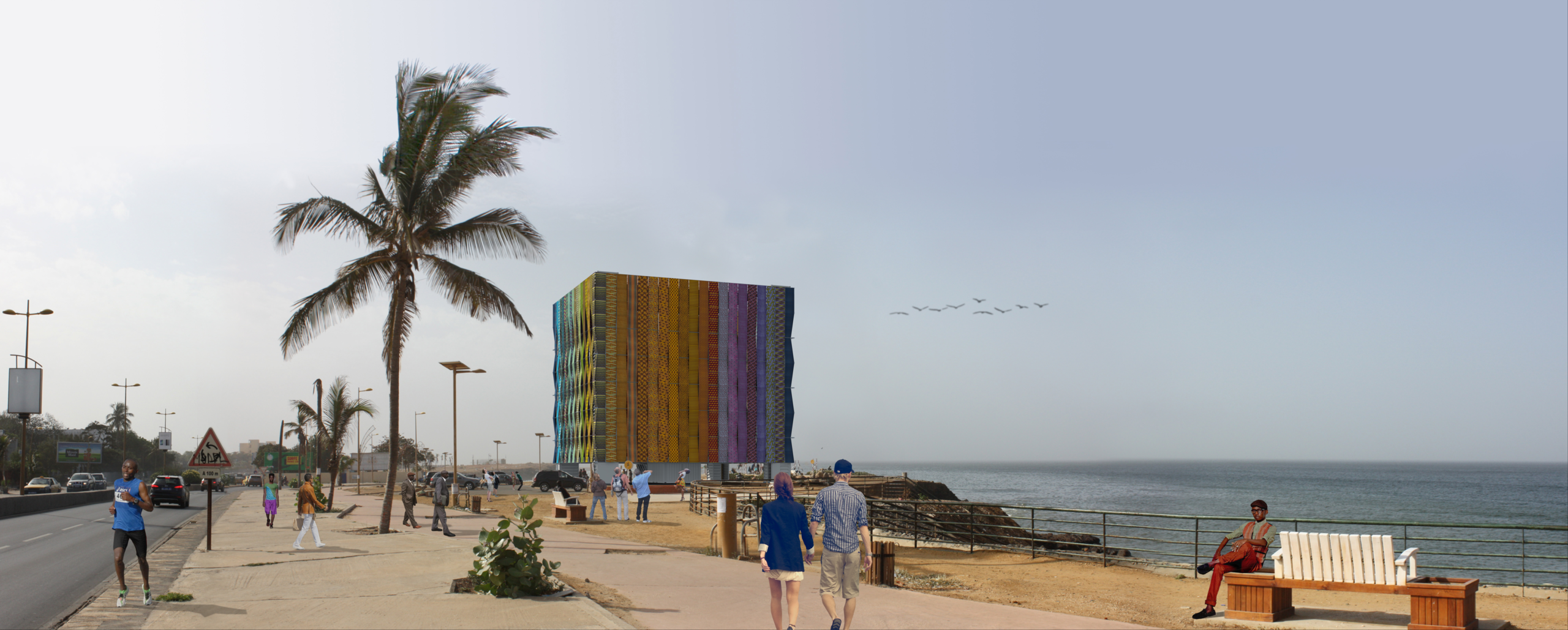 Nous avons choisi d’implanter le cinéma sur le bord de mer, face au rond point de l’université. Dans ce vaste espace, à l’horizon infini, le cinéma surgit. C’est un cube de pagnes tressés en lévitation. Une lanterne posée sur le littoral dakarois, intriguant, s’érigeant en nouveau repère urbain. Sa position stratégique le place à moins de 20 minutes de n’importe quel quartier de Dakar. Sa proximité avec l’université le rend encore plus facilement accessible par les étudiants.