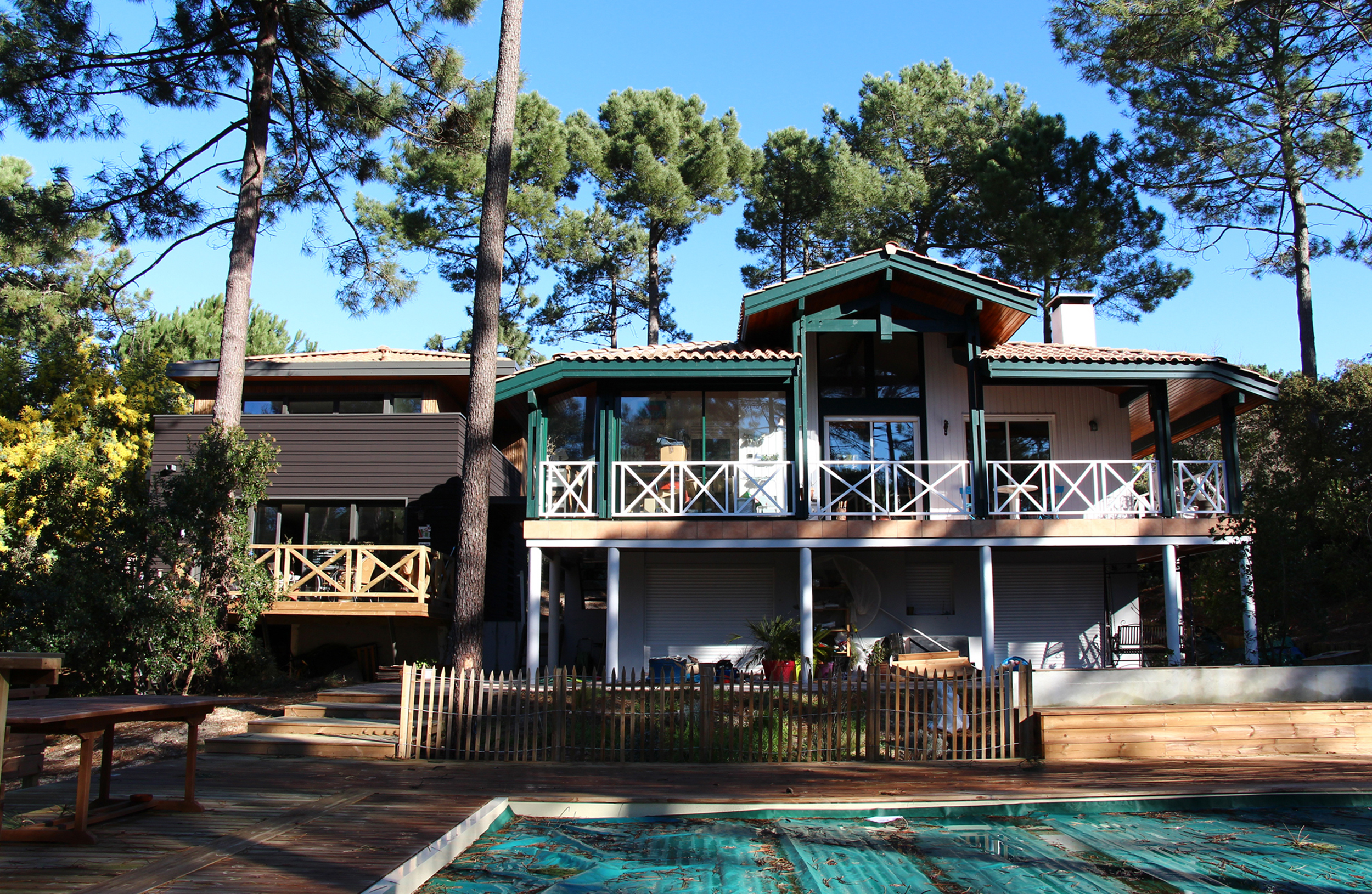Le projet d’extension se situe à l’entrée du lotissement « les hauts des green » de Lacanau. Le terrain est situé dans un environnement pavillonnaire. La propriété de 1987 m² se développe sur la déclivité de la dune. Accessible en partie haute, la maison existante surplombe la parcelle. Elle se développe sur plusieurs demi-niveaux, depuis lesquels on distingue, à travers la forêt de pins, le golfe de Lacanau en contrebas.