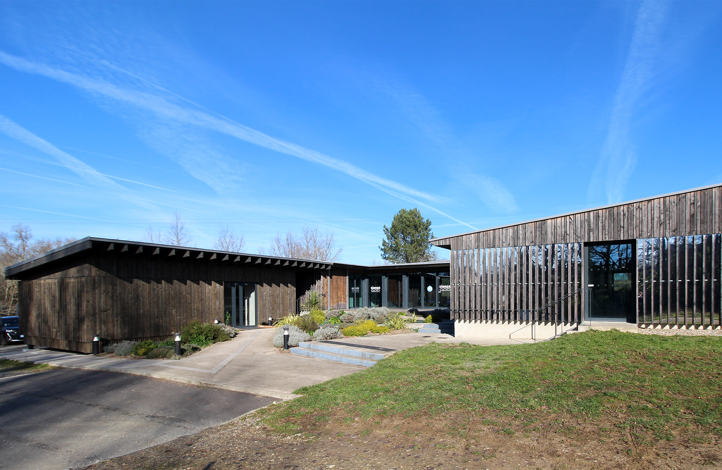 La construction s’accroche au niveau des toitures à la ligne de rive du patio d’entrée, la prolongeant et affirmant un peu plus le pourtour de l’espace central. La pente de la toiture suit la topographie du site, faisant écho à la pente de toiture de l’aile des bureaux en vis-à-vis. Bien que cela confère une inversion de pente avec l’aile du bâtiment existant sur laquelle se greffe l’extension, cette disposition permet d’être en cohérence avec la topographie du site, ouvrant l’espace d’entrée depuis le patio, et limitant l’échelle du gabarit construit vis-à-vis du parking.