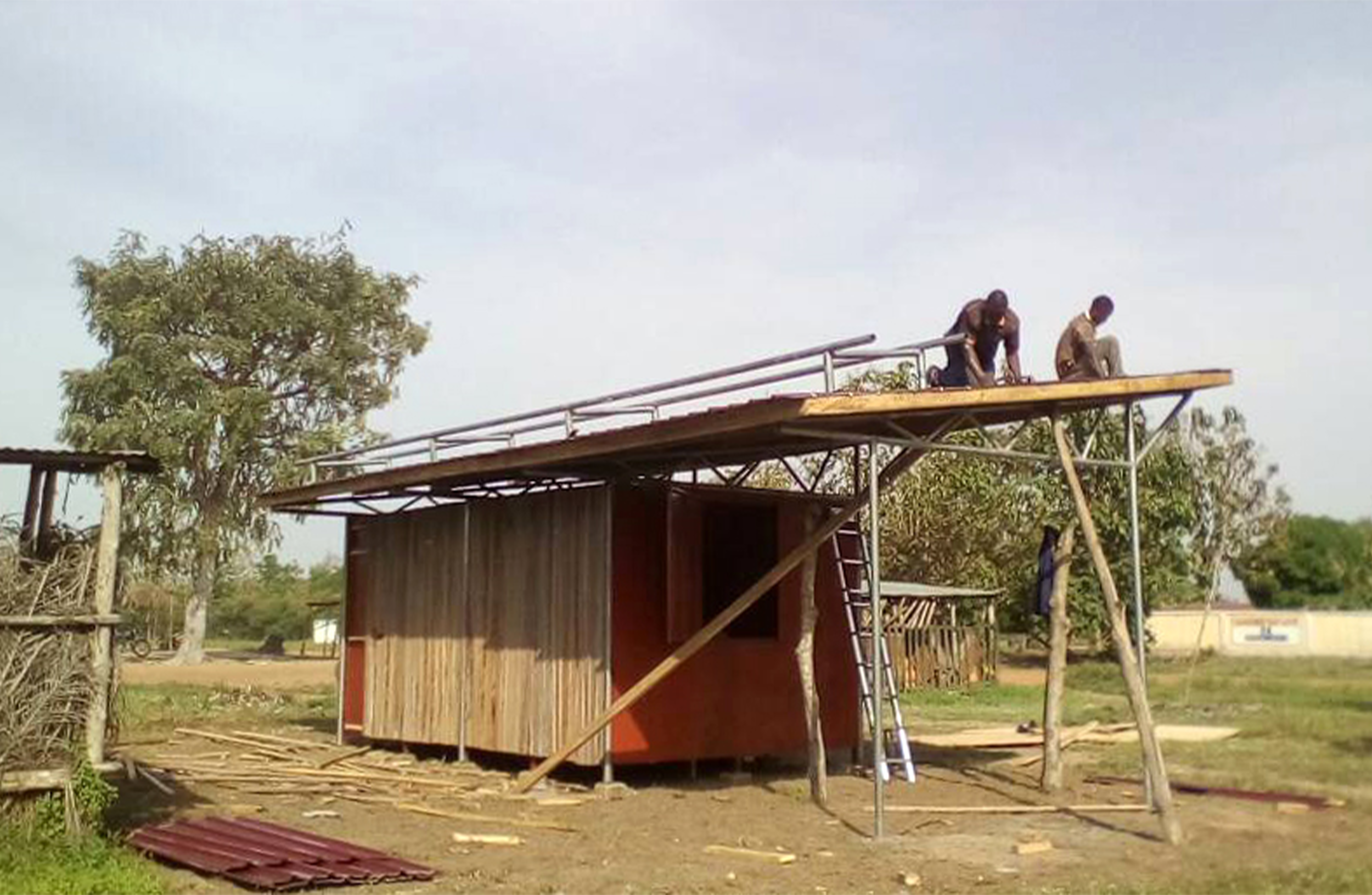 La nouvelle conception se résume en une boite préservée du rayonnement solaire et des pluies par une large toiture. Une couverture délimitant l’espace et faisant à la fois office d’ombrelle et de parapluie. La construction fait appel aux savoir-faire disponibles sur place et à des matériaux peu onéreux, voire de recyclage. Une structure tubulaire constitue le squelette du kiosque. Inspirées des créations du designer sénégalais Ousmane M’Baye, les multiples alvéoles de la cage sont remplies en tôle, si possible de récupération, et peintes. Cette première enveloppe, assurant l’antieffraction, est ensuite habillée sur les façades nord et sud d’un bardage en bambou. Ce bardage rapporté, couplé à une lame d’air ventilée, permet de préserver les boites métalliques du rayonnement solaire. Les ventelles en parties hautes et basses quant à elles, assurent une ventilation transversale des locaux. Le prolongement de la couverture délimite la terrasse associée au kiosque. On peut s’y installer pour consommer les sucreries en ventes dans la boutique et regarder les informations sur la télévision.