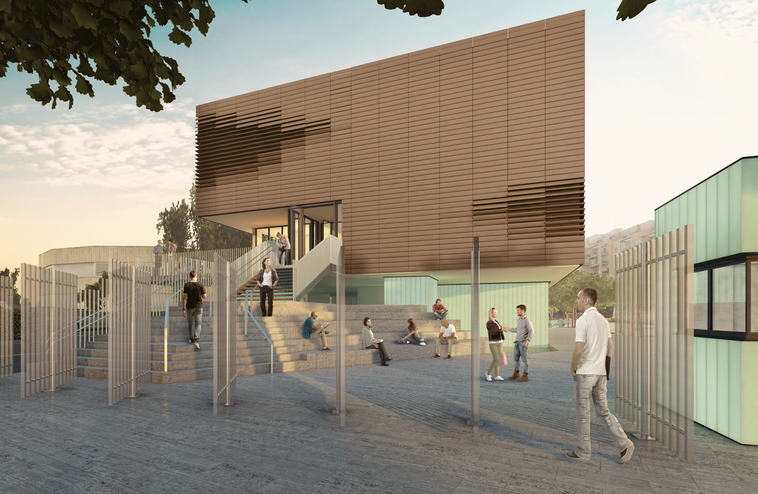 Afin de répondre à ces enjeux, le partie pris du projet est de tirer profit du dénivelé du terrain et de diversifier les accès : un accès bas depuis la rue Murta et un accès haut depuis les espaces du lycée.