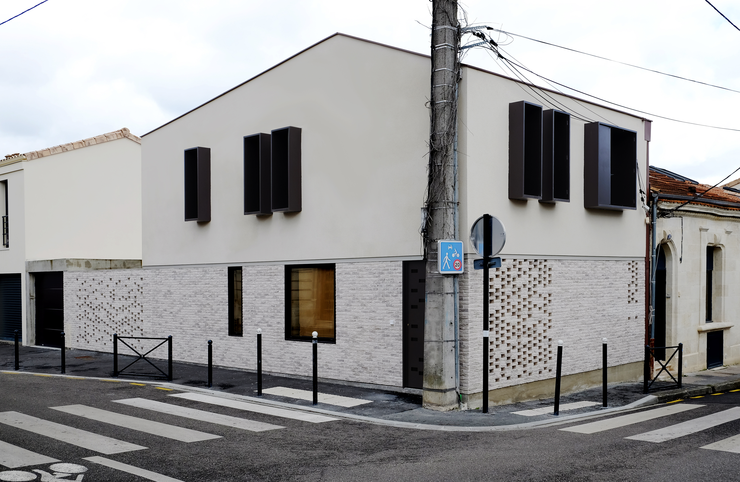 Dans un souci d’intégration au tissu urbain, bien que l’écriture de la maison se veuille contemporaine, la palette chromatique identifiée pour la maison s’inspire des tonalités de la pierre, des enduits naturels, du bois et de la tuile, sans pour autant utiliser ces matériaux. Il s’agit ainsi d’avoir recours à une filiation chromatique, et pas nécessairement à un mimétisme.